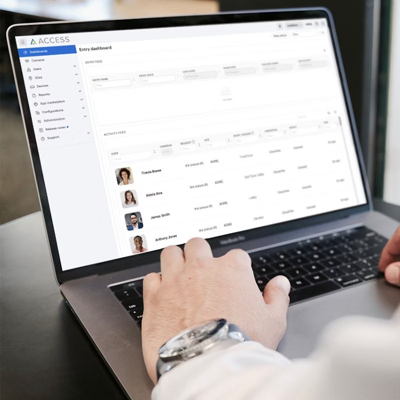 Tüm sistemi tek bir arada yönetin:Desecure Cloud donanımını girişlerle ilişkilendiriyor, gerçek zamanlı erişim aktivitelerini canlı görüntülerle birlikte izliyoruz. Entegre ve özelleştirilebilir yönetim panellerimiz sayesinde sistemi dilediğiniz cihazdan kontrol etmenizi sağlıyoruz.