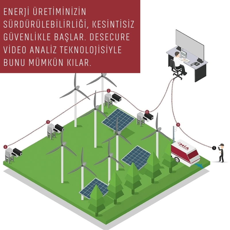 Desecure Technology olarak enerji santrallerinde tüm güvenlik altyapısını merkezi ve entegre şekilde yönetiyoruz. MİA (Mobil İzleme Aracı), MİK (Mobil İzleme Kulesi), MİD (Mobil İzleme Direği) ve MAS (Mobil Alarm Sistemi) güvenlik ürünlerimiz ile tüm sistemleri tek platformda buluşturuyoruz.